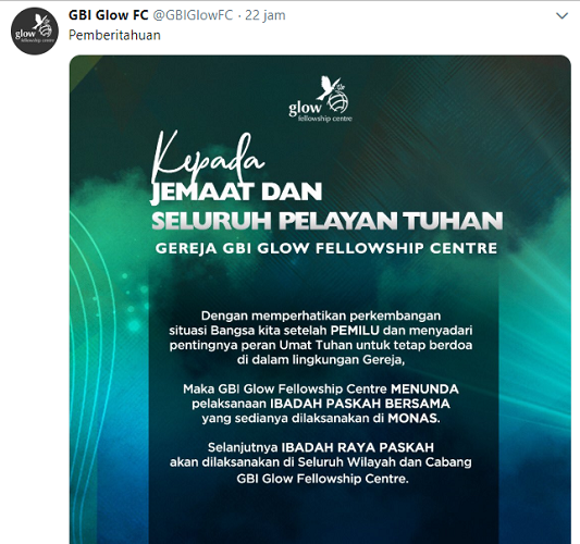 “Kepada seluruh jemaat dan seluruh pelayan Tuhan Gereja GBI Glow Fellowship Centre. Dengan memperhatikan perkembangan situasi bangsa kita setelah Pemilu dan menyadari pentingnya peran Umat Tuhan untuk tetap berdoa di dalam lingkungan gereja, maka GBI Glow Fellowship Centre menunda pelaksanaan Ibadah Paskah Bersama yang sedianya dilaksanakan di Monas,” demikin ditulis akun Twitter @GBIGlowFC.